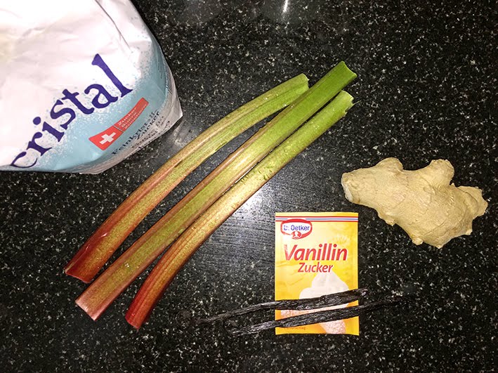 Wenn man die Ingwerscheiben und die Vanilleschoten aussortiert, kann man aus den Rhabarberresten ganz schnell einen Kompott machen. Hat ein tolles Aroma vom Vanille, echt yummie!