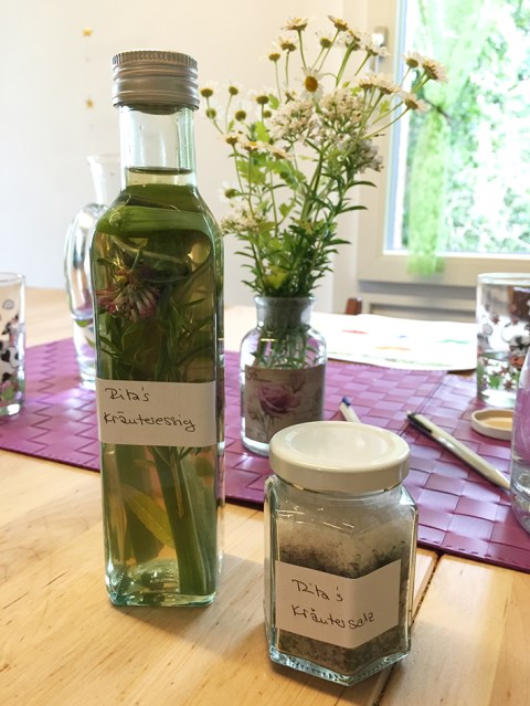 Zum Schluss stellten wir in Maja’s Kräuterstübchen ein Kräutersalz und einen Kräuteressig her mit eigens gepflückten Kräutern aus ihrem Garten. Sie müssen noch zwei Wochen ruhen… ich bin gespannt auf das Ergebnis meiner Mischkunst… 😉