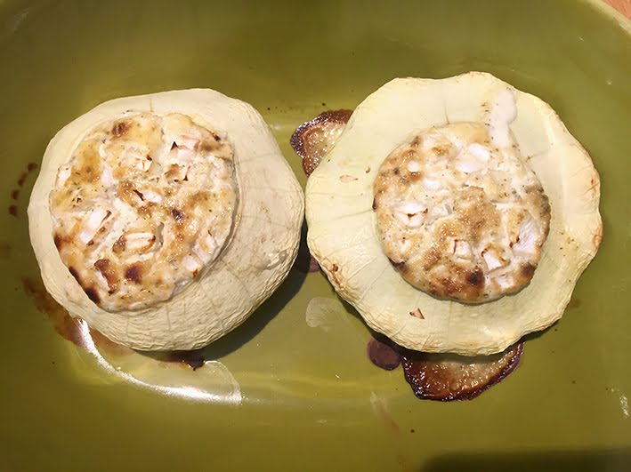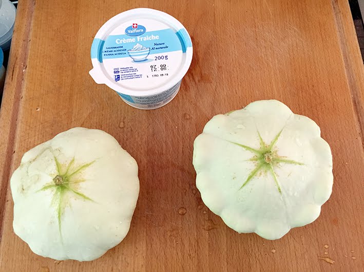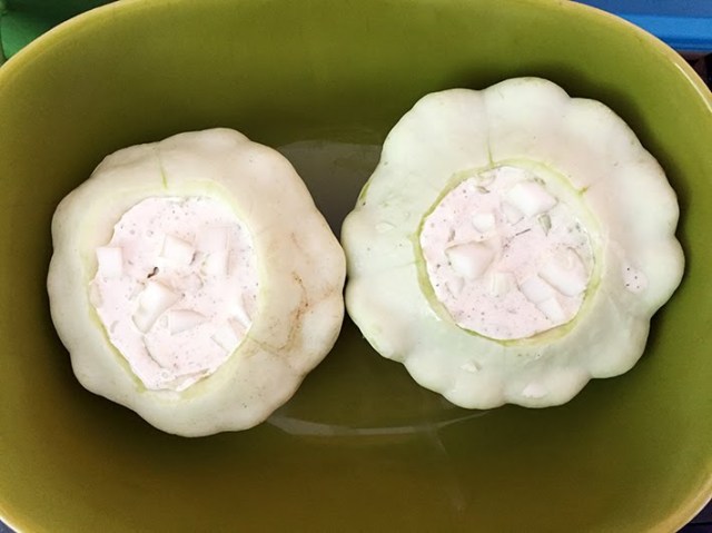 Die ausgehöhlten Patisson mit der Crème fraiche, die ich mit Knoblauch und Gewürzen verfeinert habe füllen… das Fleisch vom aushöhlen der Patisson kleinschneiden und in die Crème fraiche geben und bei 180 Grad (Umluft) ca. 40 Minuten in den Ofen… super lecker!!!!