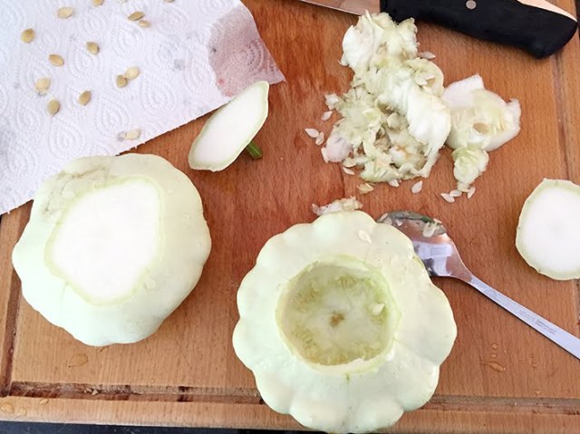 …aushöhlen. Übrigens die Kerne der Patisson oben auf dem Küchenpapier werde ich trocknen und nächstes Jahr im Garten pflanzen.