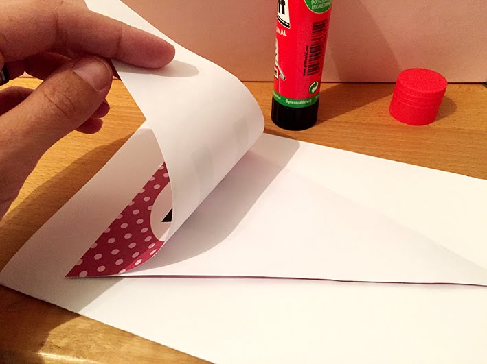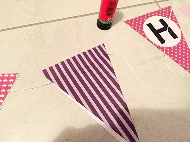Wimpel ausschneiden und als erstes nur oben zusammenkleben. Schnur reinlegen und den Rest der Wimpelfläche zusammenkleben. So braucht es keine Löcher zur Befestigung der Schnur und ausserdem kann man so die einzelnen Wimpel im Nachhinein auch noch Anordnen.