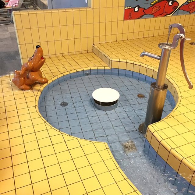Alles was das Kinderherz begehrt: Wasser, Rutschbahn, lustige Figuren, Spielzeug, eine kleine «Höhle»