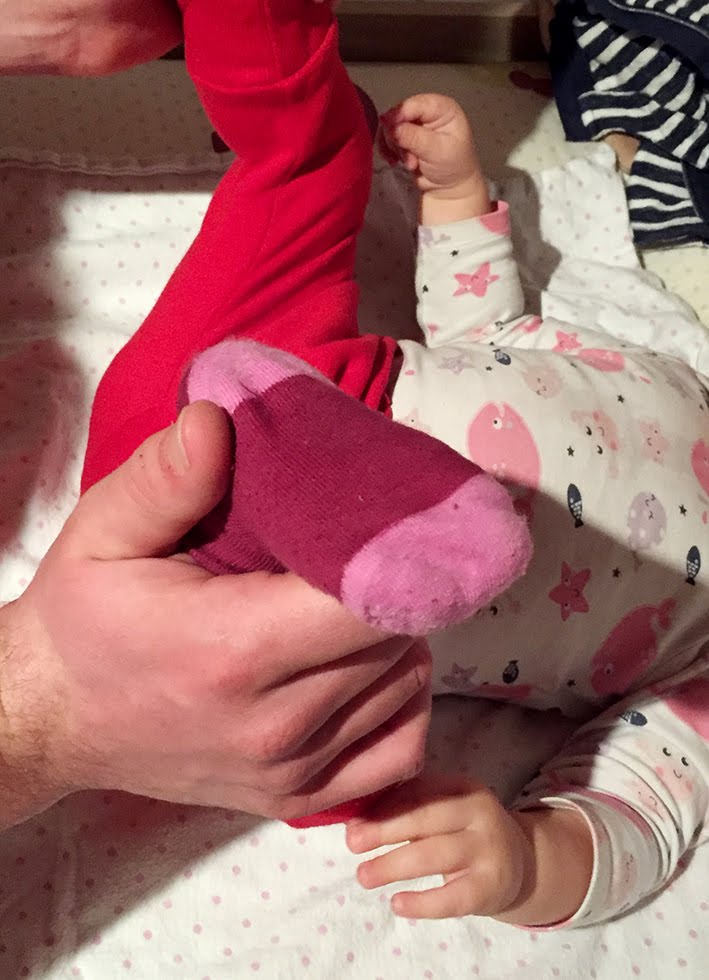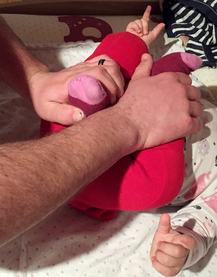 Während das Baby auf dem Rücken liegt, nimmt man seine Beine in jeweils eine Hand und verschränkt sie langsam und mit sanftem Druck in Richtung seines Bauches. Unsere Tochter hat dies jeweils sehr genossen und dem Bäuchlein gab das eine wohlige Massage!