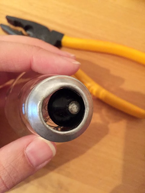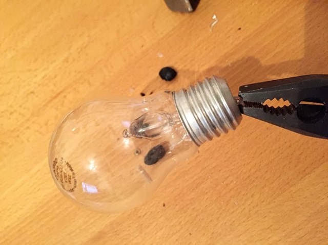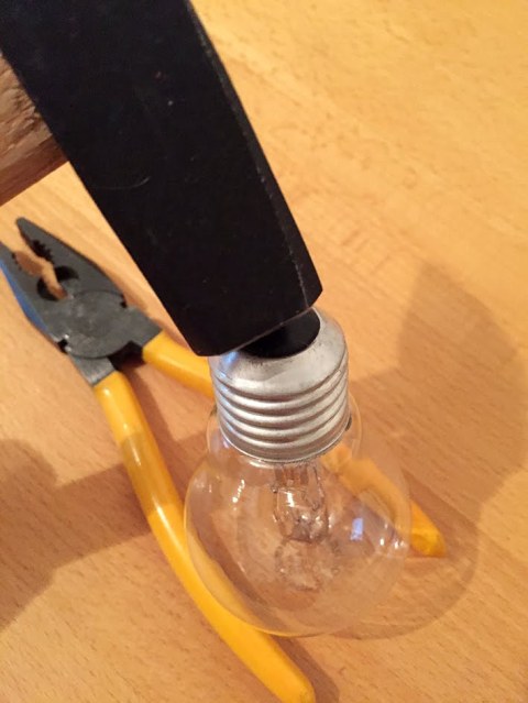 Mit der Zange könnte ihr den inneren Teil aus der Glühbirne ziehen. Achtung auf die Scherben!