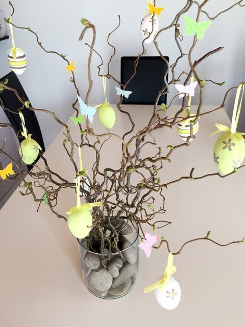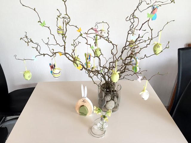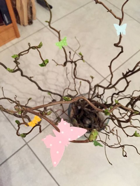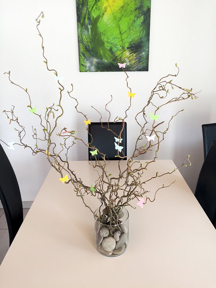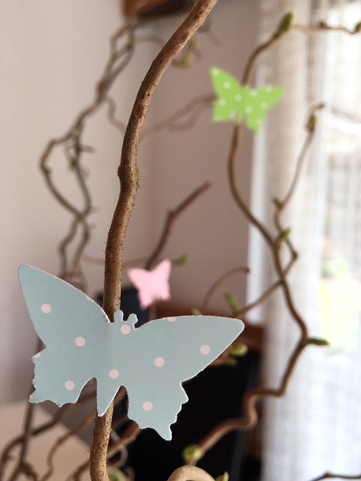 Ostern steht vor der Türe und somit ist es an der Zeit endlich die Osterdeko rauszuholen… Wir haben dieses Jahr erstmals einen Osterbaum. Als Äste haben wir ganz traditionell die Haselnuss Korkenzieher, da meine Tante einen solchen Strauch im Garten stehen hat – perfekt! Dazu habe ich ein paar Schmetterlinge ausgestanzt und an die Äste geklebt. Ich finde sie wahnsinnig süss und so frühlingshaft! Den Osterhasen wollte ich eigentlich aus Büchern nähen, aber da kam doch ein dreifach gefalteter Prospekt ins Haus geflattert, wie praktisch, nun haben wir ganz bunte Osterhasen… und die Ostereier dürfen natürlich nicht fehlen…