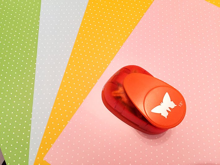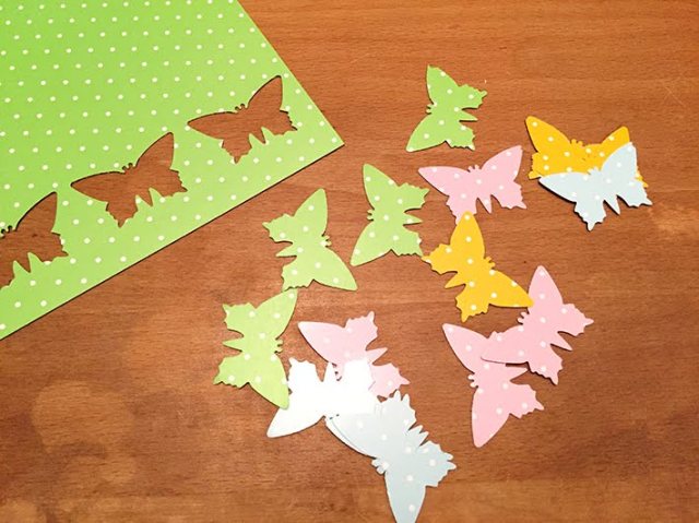 Die ausgestanzten Schmetterlinge sind mit einem dünnen Klebbandstreifen an den Ästen angeklebt.