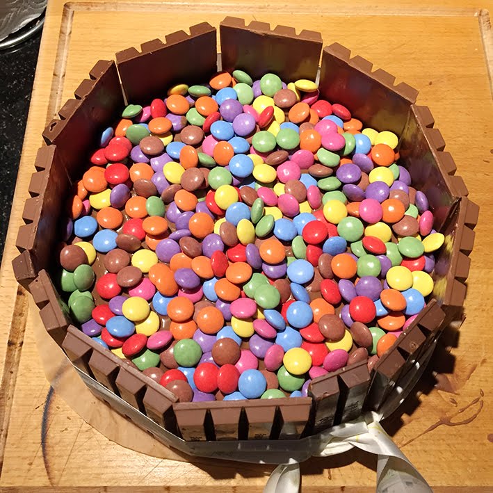 - KitKat (braucht etwa 4 3er Packs) um den Kuchen aufstellen, mit einem Band fest binden