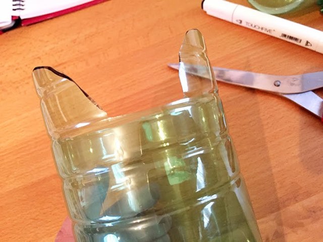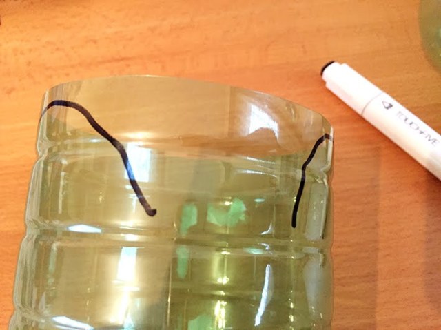 Die PET-Flasche etwa in der Mitte in zwei Teile schneiden. Den Teil mit dem Deckel übrigens nicht wegwerfen – damit werde ich bald ein tolles Spielzeug basteln!!!