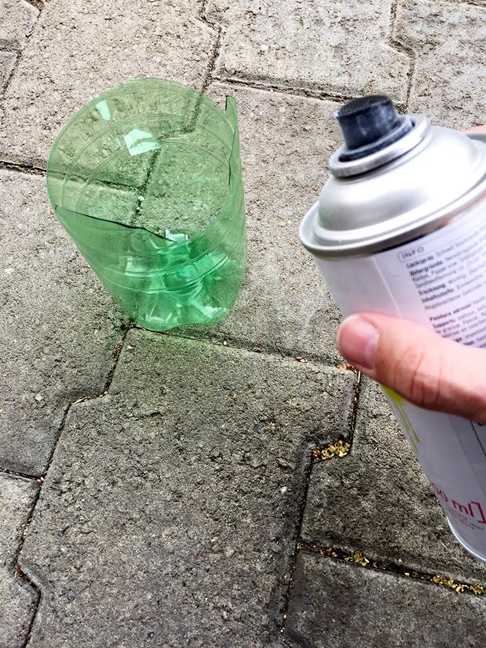 Auf den unteren abgeschnittenen Teil der Flasche zeichnet ihr zwei Panda-Ohren und schneidet sie der Linie nach aus und sprüht das ganze Teil mit weisser Sprayfarbe an (ihr könnt natürlich auch den Pinsel nehmen!).