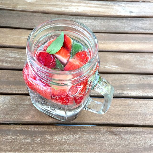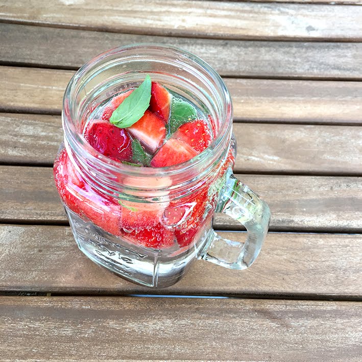 Erdbeeren in Stücke schneiden. Ein paar Blättchen Basilikum abzupfen und zu den Erdbeeren in ein Glas geben. Mit Wasser auffüllen, geniessen!