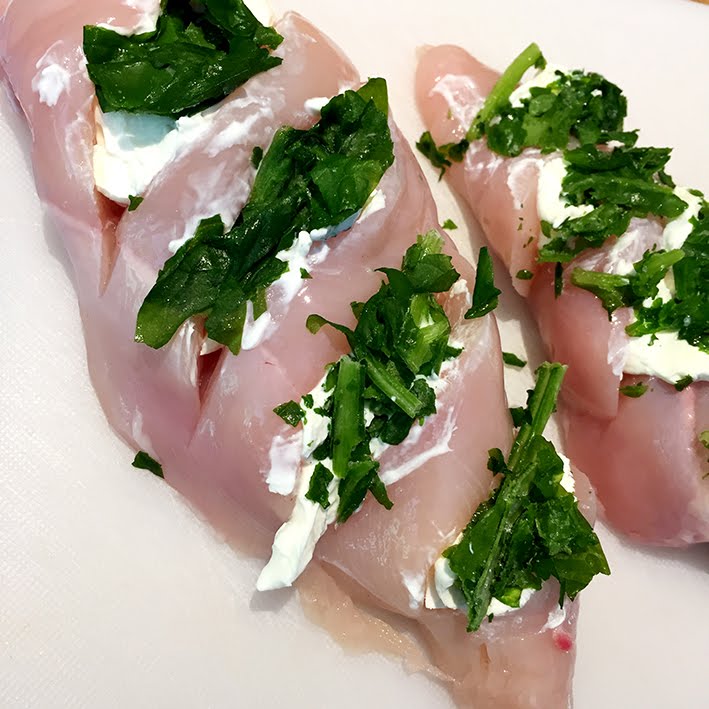 Zum Mittagessen gibt’s Pouletbrust gefüllt mit Frischkäse und Spinat – lecker!!!