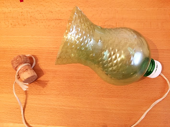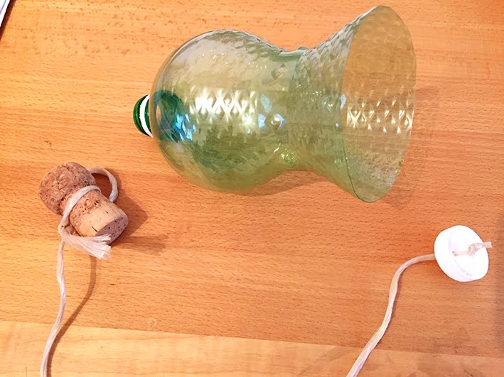 Das andere Ende um einen Korkzapfen binden. Länge der Schnur abmessen so dass sich der Korken gut in die Flasche werfen lässt – je länger die Schnur desto schwieriger die Aufgabe.