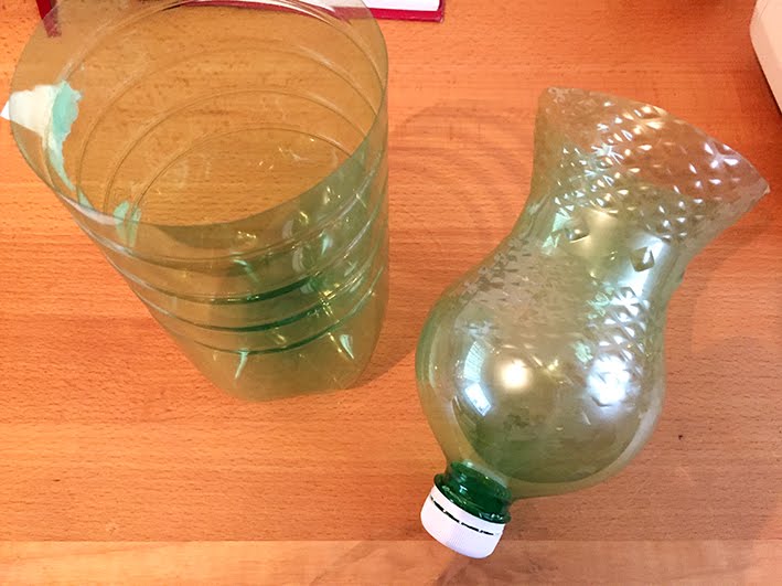 Die PET-Flasche etwa in der Mitte auseinander schneiden. Den unteren Teil habe ich für den Panda-Topf verwendet.