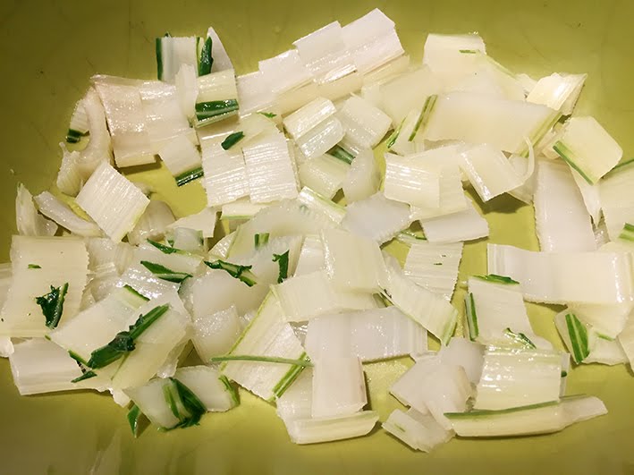 - Krautstiele in Blätter und Stängel trennen. Blätter längs halbieren. Erst Stiele, dann Blätter in siedendem Wasser blanchieren. Stiele: 4 bis 5 Minuten, Blätter eine Minute. Herausnehmen, kalt abschrecken. Blätter abtropfen lassen, auf einem Küchentuch ausbreiten. Stiele in 3 cm breite Stücke schneiden, in der Form verteilen.