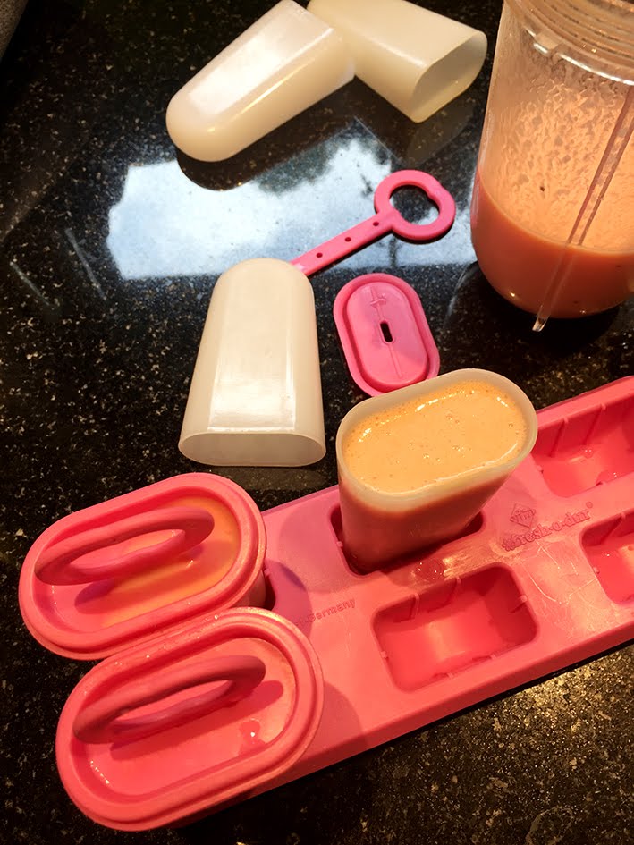 Eine andere Variante sind Smoothieglacen! Da wir alle wahnsinnig gerne Smoothies haben, habe ich einen Smoothie zubereitet und ihn in die Glaceförmchen eingefüllt. Vier bis 6 Stunden, am Besten über Nacht, in die Tiefkühltruhe und fertig!