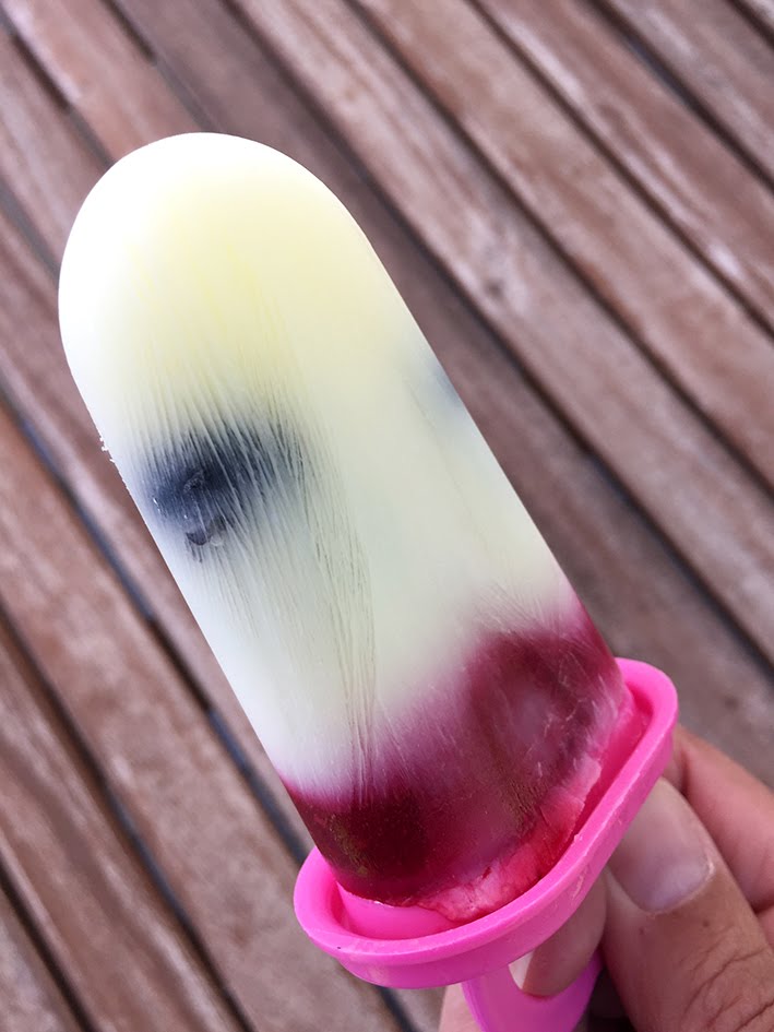 Diese Variante besteht aus Naturejoghurt gemischt mit ganzen Heidelbeeren aufgefüllt mit pürierten Himbeeren. Ins Eisfach oder den Gefrierschrank – fertig!