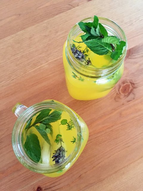 - Lavendel-Eiswürfel beigeben, Thymian abzupfen und ins Glas geben und mit beiseite gestellter Minze verzieren.