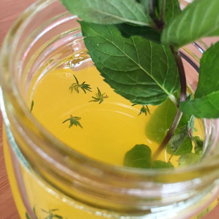 - Honig darunterrühren, Pfefferminze, Thymian, Kurkuma und Zitronensaft beigeben, kalt stellen.