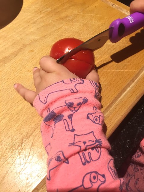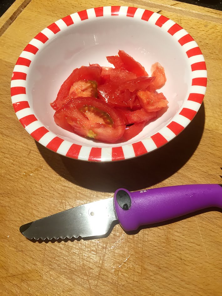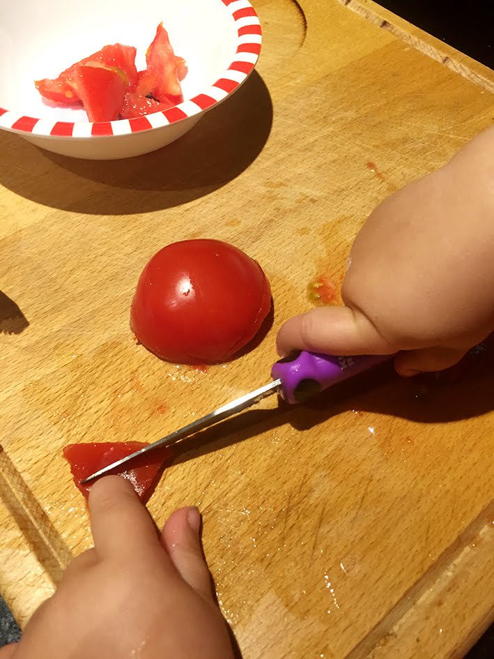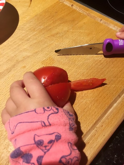 Die kleine Maus hat die ganze Tomate ohne Hilfe geschnitten – nicht schlecht für ihre zwei Jahre – oder? Ich war richtig stolz auf sie – und sie erst! Vor allem als sie dem Papa erzählt hat, dass sie die «Mate» (=Tomate) alleine geschnitten hat! Ich sage euch – ich bin voller Stolz und Freude fast geschmolzen…