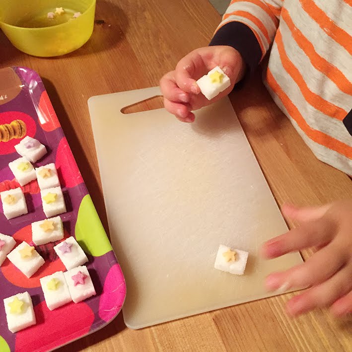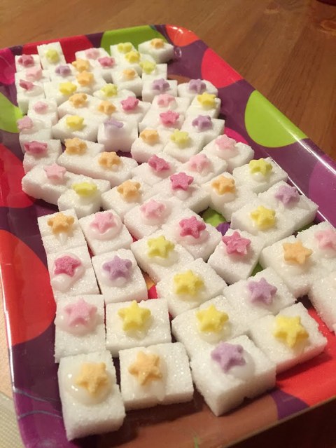 Den Puderzucker mit etwas Wasser anrühren – er dient als essbaren Klebstoff! Wenn die Masse schön zähflüssig ist, ist sie genau richtig. Einen kleinen Tupfer der Puderzuckermasse auf die Mitte eines Würfelzuckers geben und ein Deko-Sternchen darauf kleben. Diese Arbeit hat meine Tochter übernommen und es hat ihr sichtlich Spass gemacht! Trocknen lassen und in kleine Säckchen abfüllen. Schön mit Geschenkband und einer Etikette verzieren – fertig.