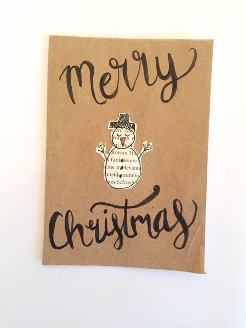 Auf dem Text des alten Buches oder der alten Zeitung einen Schneemann malen. Etwas ausserhalb der Kante entlang schneiden. Das Packpapier auf die Grösse der leeren Karte zuschneiden – es dient lediglich zur Erhöhung des Kontrasts! Den Schneemann auf die Karte kleben. Ein paar schöne Worte dazu schreiben fertig!