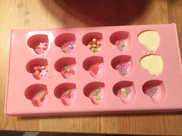 Zuerst durfte meine kleine Maus in alle Formen Deko-Streussel verteilen. Danach die Schokolade schmelzen und jede einzelne Form mit Schokolade auffüllen. Über Nacht im Kühlschrank abkühlen lassen. Vorsichtig aus der Form drücken und in kleine Säckchen abfüllen. Schön mit Geschenkband und einer Etikette verzieren – fertig!