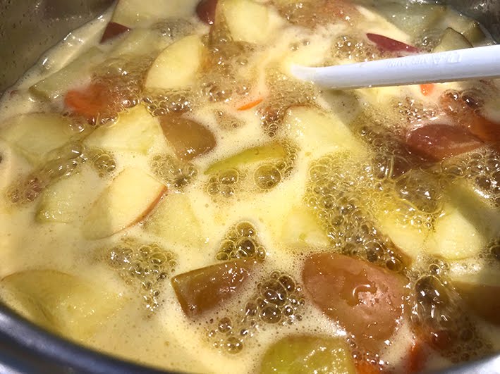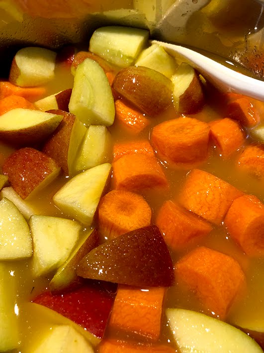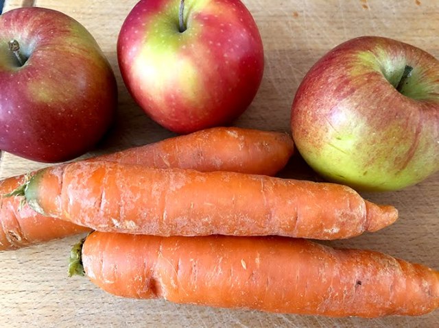 Die Karotten schälen und in Stücke schneiden. Die Äpfel habe ich nur in Stücke geschnitten ohne zu schälen. Orangen- und Zitronensaft dazugiessen und aufkochen.