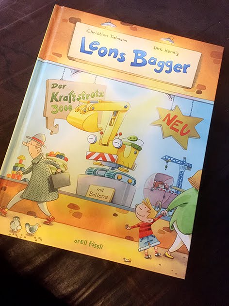 Vor ein paar Monaten war es dann so weit, sie wollte das ich ihr eine Geschichte vor las und zwar die vom Bagger. Kurz vorher haben wir nämlich von Orell Füssli ein Buchpaket bekommen wo dieses Buch dabei war. Keine Ahnung woher sie diese Vorliebe zu Baggern hat, wahrscheinlich von ihrem Papa…