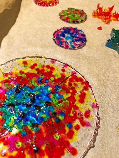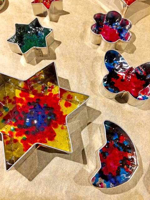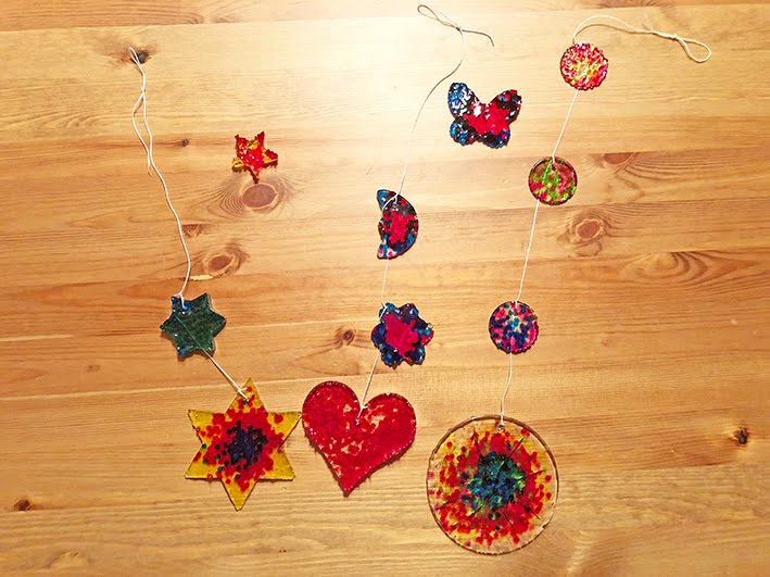 Das Material erkaltet schnell und lässt sich einfach aus den Formen lösen. Während es noch warm ist mit einem spitzigen Gegenstand (ich habe einen Holzspiess verwendet) ein Loch in die Formen machen, damit man die Formen ans Fenster hängen kann.