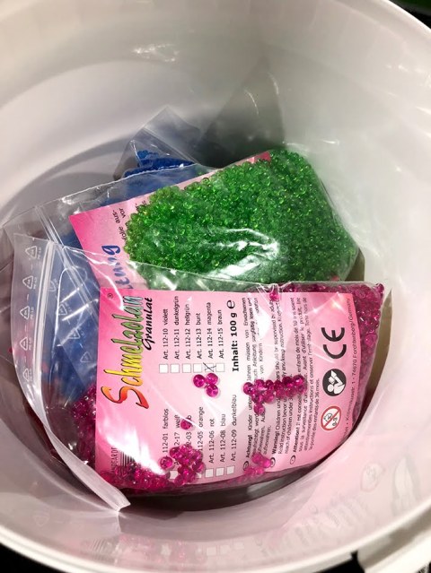 Die Förmchen nach belieben mit dem Granulat befüllen. Keine zu dicke Schicht machen! Im kleinen Topf oben ist Essig. Er neutralisiert den beim Schmelzen entstehenden Geruch etwas!