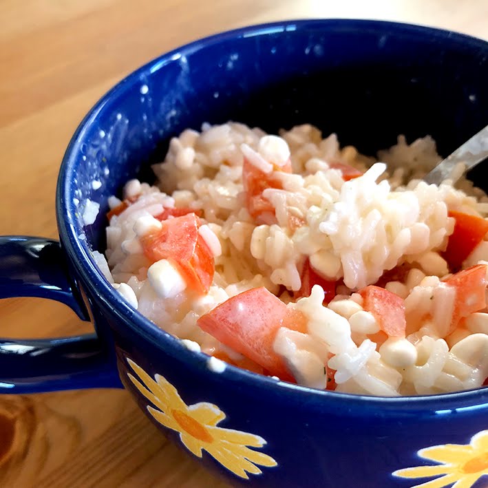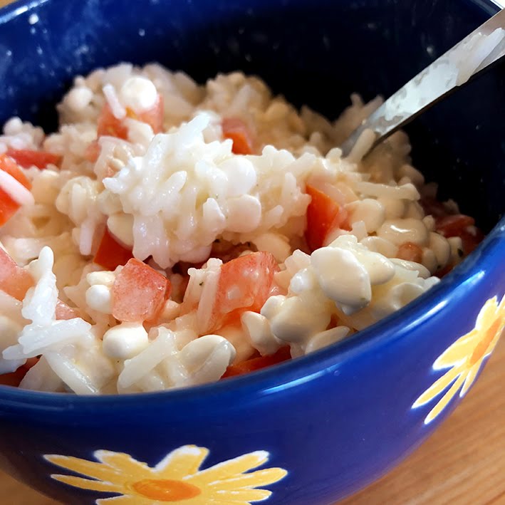 Der noch warme Reis kühlt sich wegen des Hüttenkäses schnell ab, ist also sofort essbereit – ich esse ihn immer noch lauwarm – so schmeckt er mir einfach am Besten!