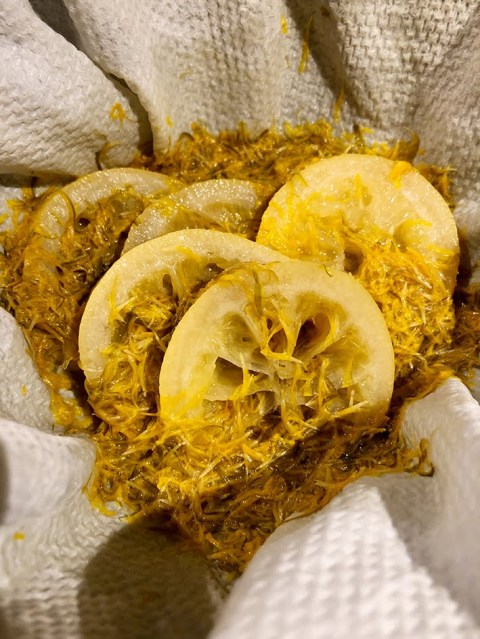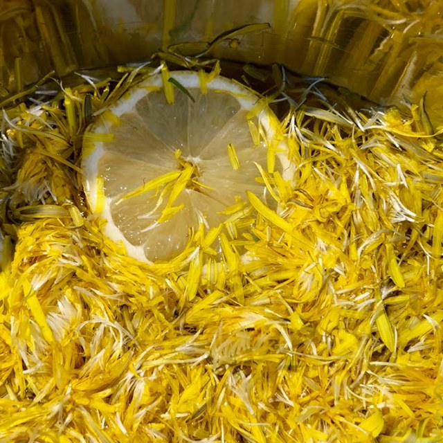 Wasser in einen Topf geben. Zitronenscheiben und die gezupften Löwenzahnblüten dazugeben und 5 Minuten kochen. Zugedeckt über Nacht stehen lassen.