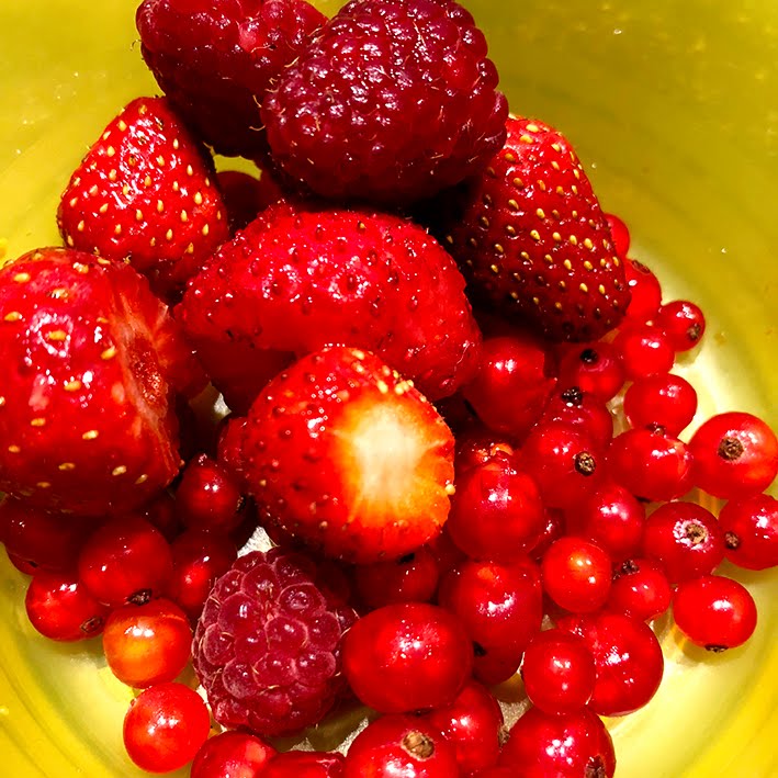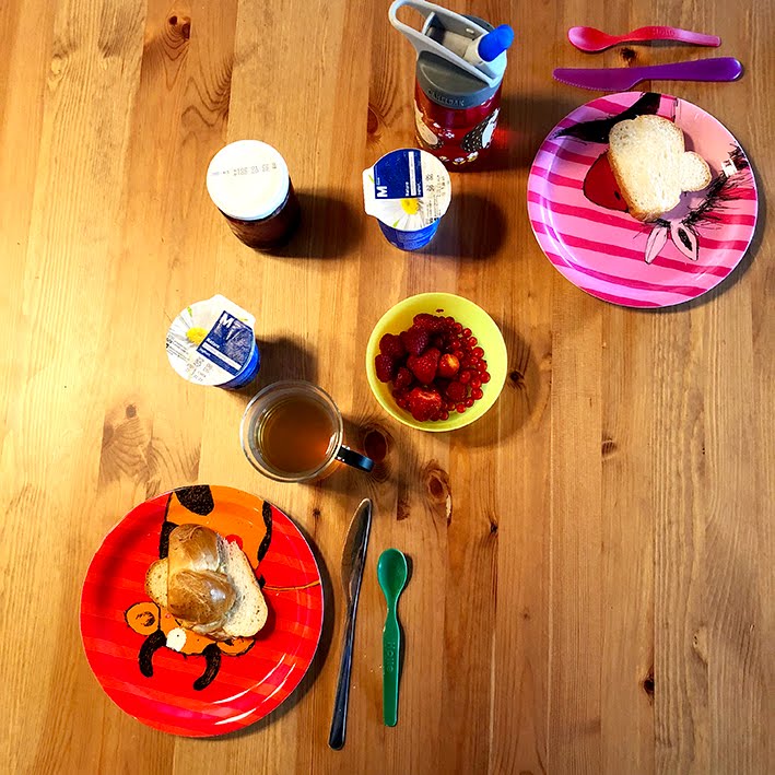 Wir haben Beeren übrig von gestern… die kommen zum Frühstück auf den Tisch.