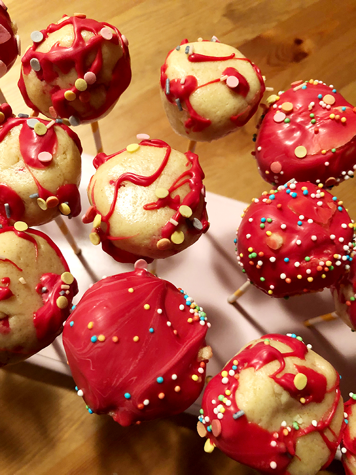 Der Teig ist ohne Eier gemacht, so sind die Cake Pops ohne Risiko zum geniessen!