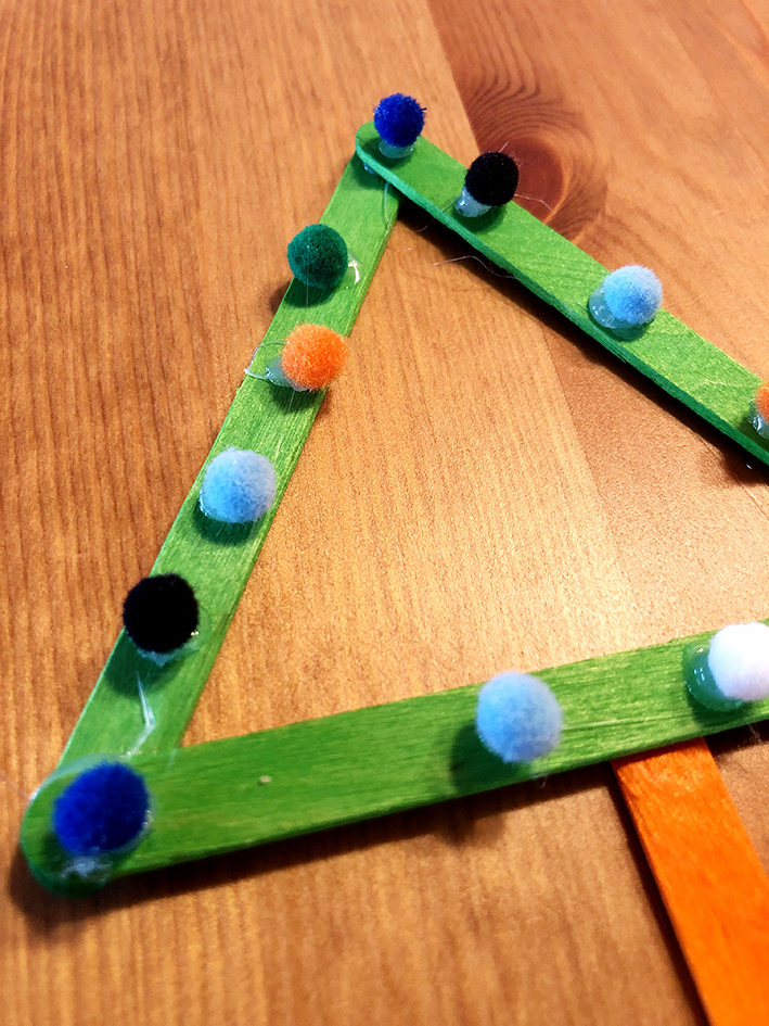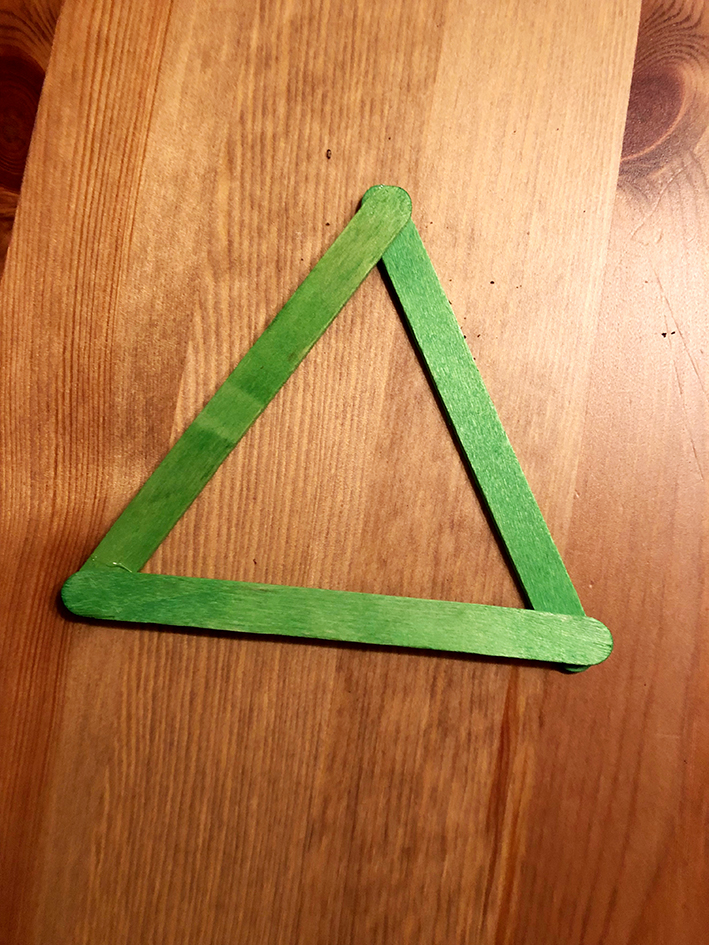 Drei grüne Holzstäbchen zu einem Dreieck (Baum) zusammenkleben. (Man kann auch die Eisstiele vom Sommer aufbewahren… ich bevorzuge allerdings nicht abgeleckte… 😉