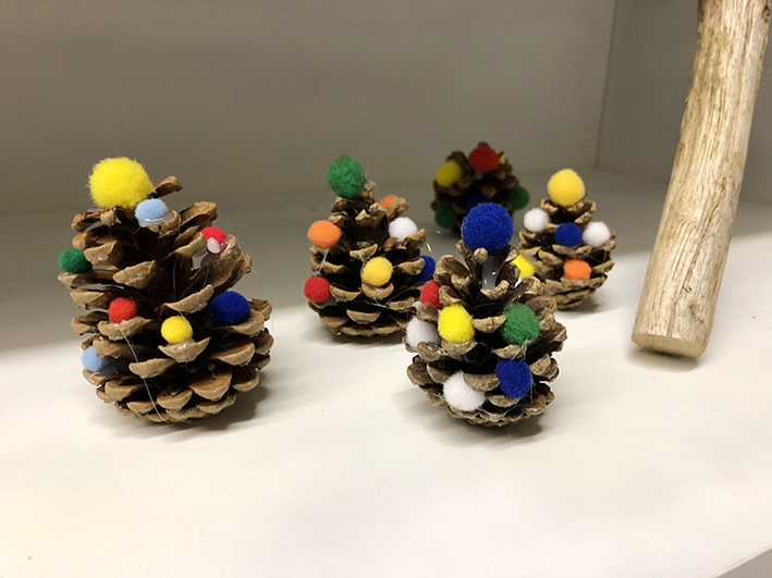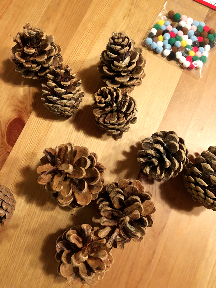 Auf den Tannzapfen in beliebigen Abständen mit Heissleim kleine Filzkugeln ankleben.