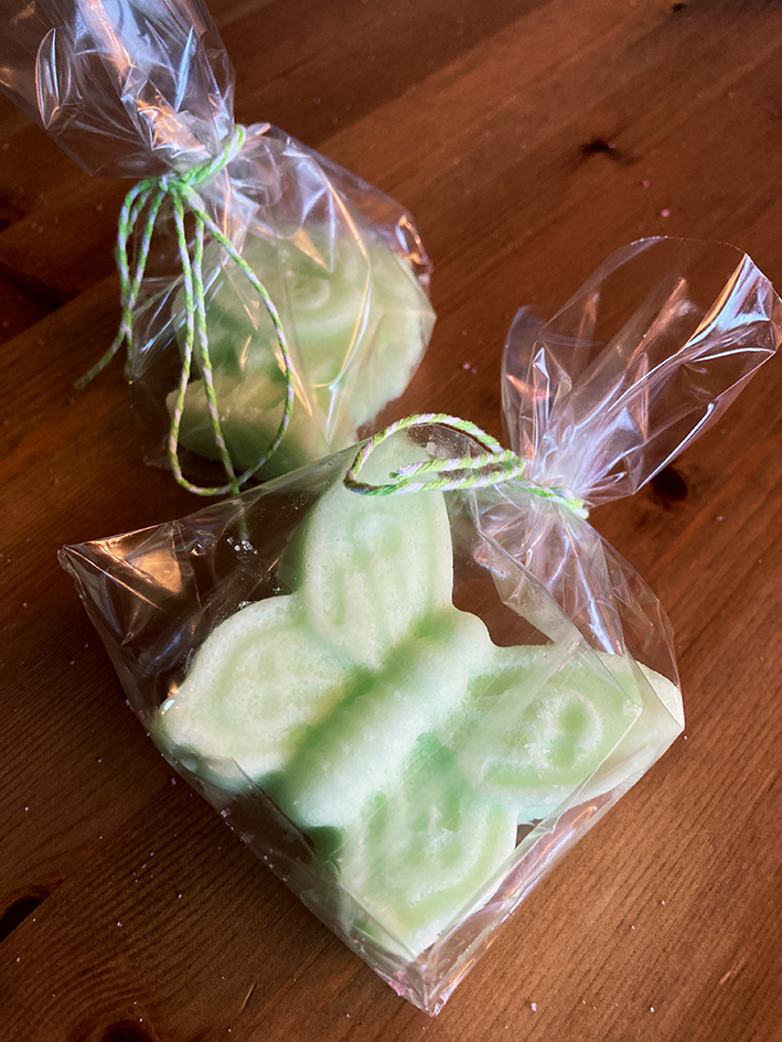 Kokosöl in der Mikrowelle schmelzen, Badeöl dazugeben. Das ganze zum Pulver geben und gut zusammenkneten.