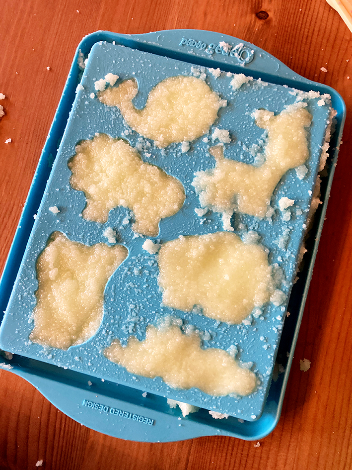 In die Formen drücken, so dass sie schön fest sind und am Besten über Nacht in den Kühlschrank stellen.