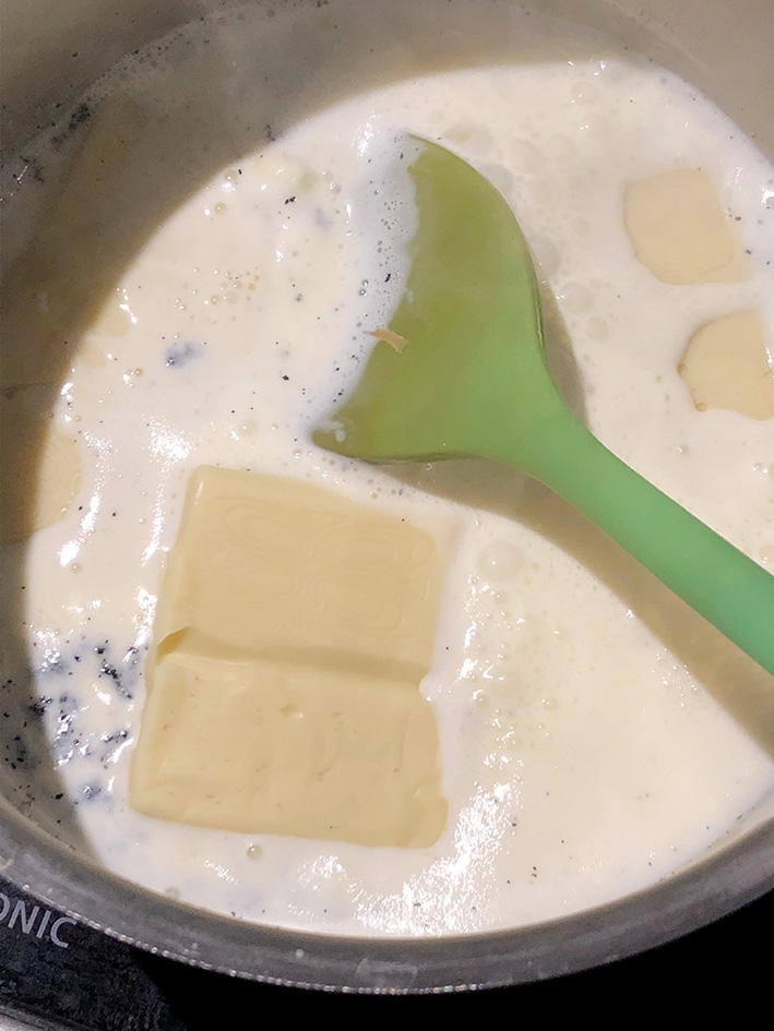 Den Halbrahm in eine Pfanne giessen. Die Vanilleschote auskratzen, zum Rahm geben, langsam erhitzen. Die Butter im Rahm unter rühren langsam schmelzen bis es eine crèmige Masse ist.