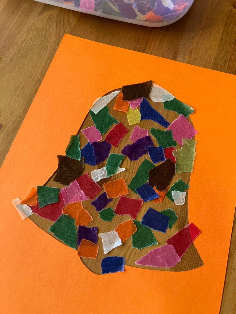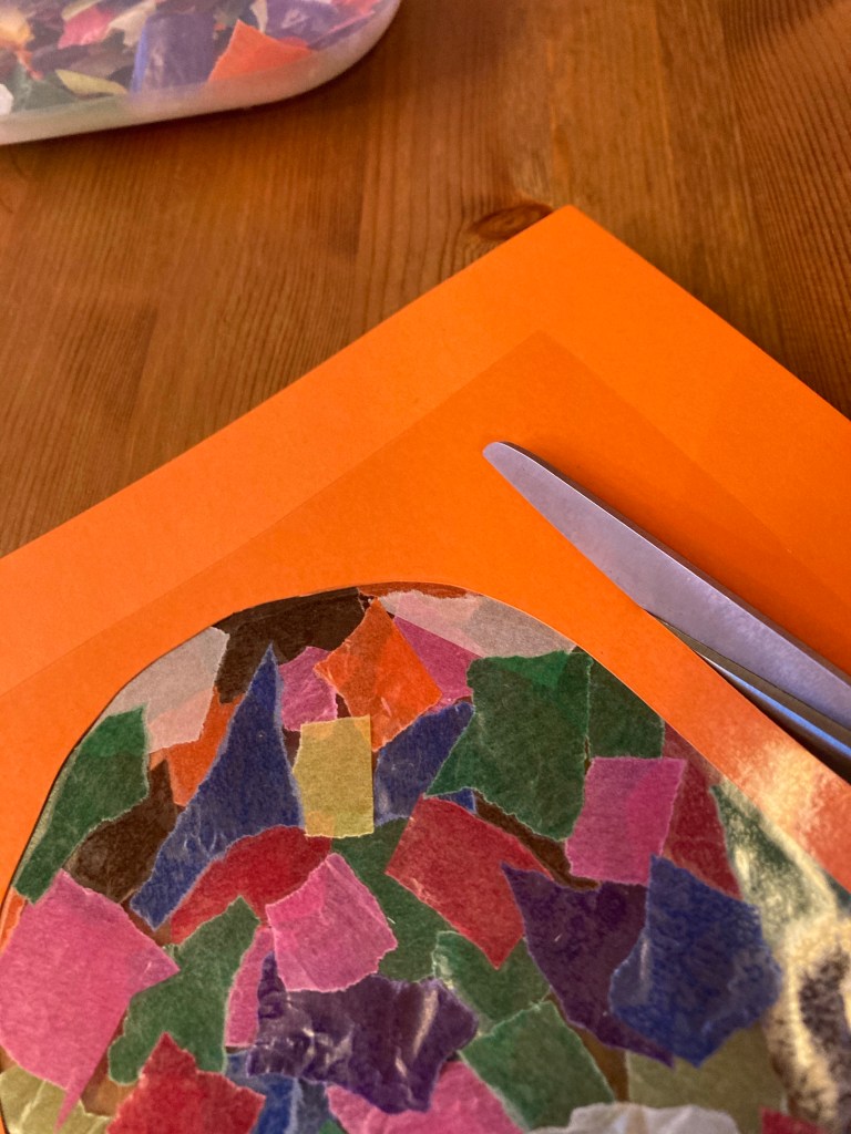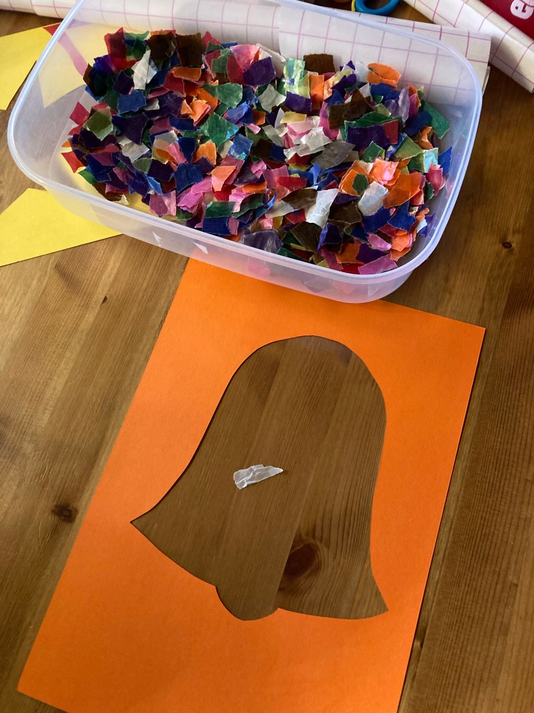 Das Transparentpapier in kleine Fötzel gerissen und auf die Klebefolie geklebt.