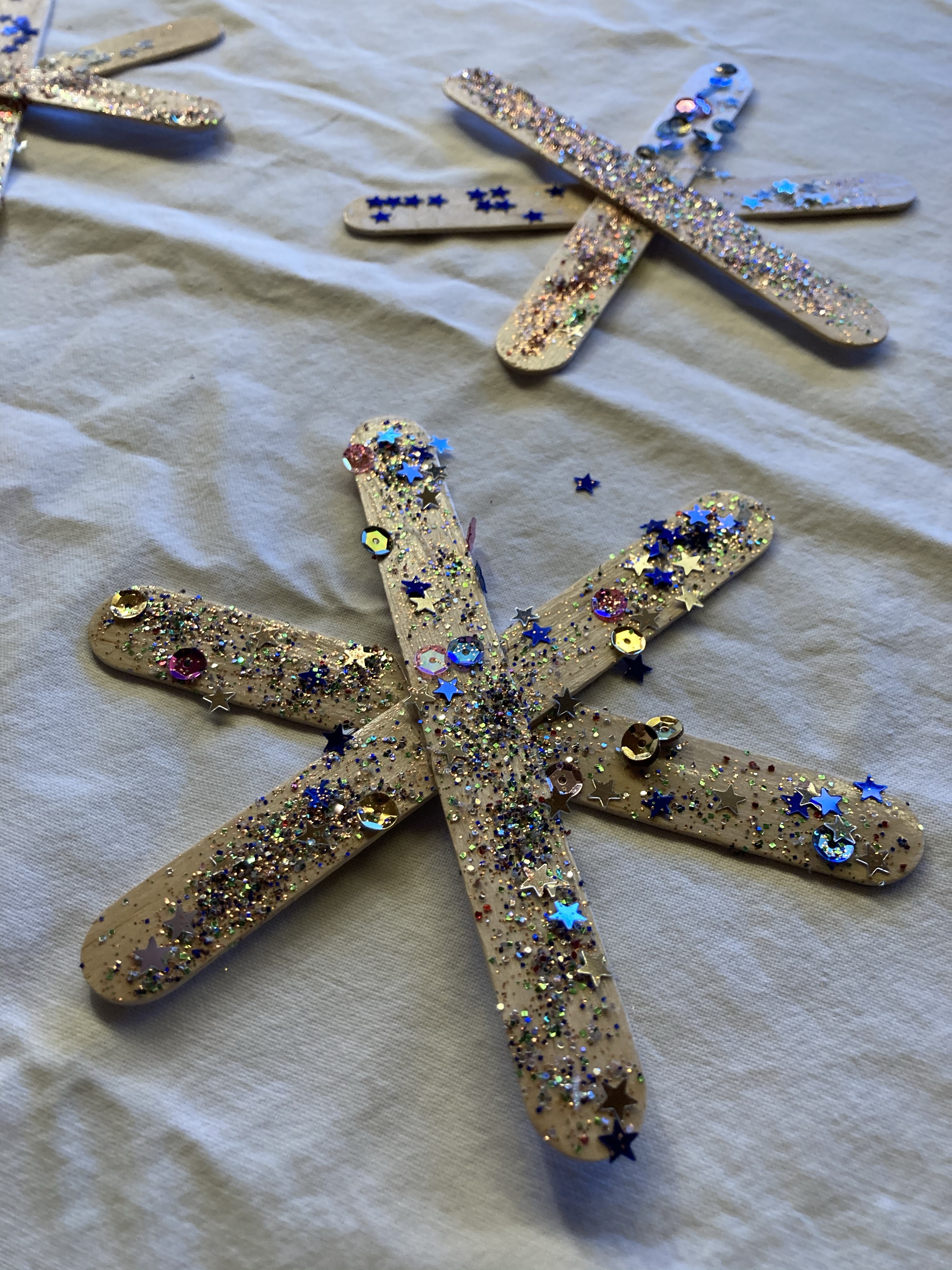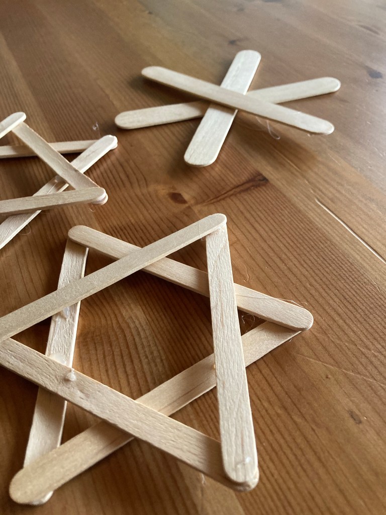 Als erstes die Holzstäbchen mit Heissleim in der gewünschten Sternenform zusammenkleben