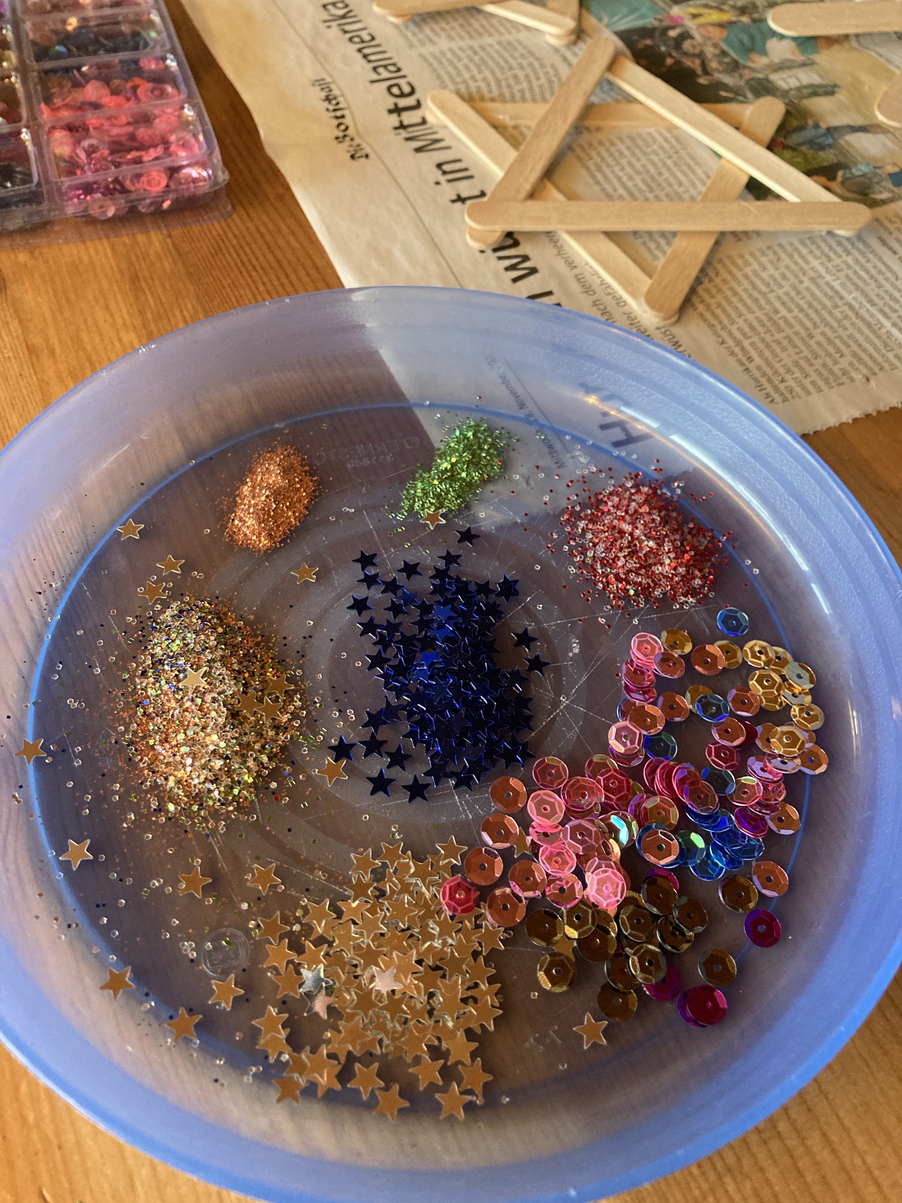 Die Holzstäbchen mit durchsichtig trocknendem Leim anstreichen und nach belieben mit Pailetten, Glitzerstaub oder was gefällt verzieren. Durch den deckenden Kleber können Pailetten und Glitzerstaub einfach auf die Stäbchen gestreut werden, was auch schon kleine Kinder super machen können! Gut trocknen lassen.