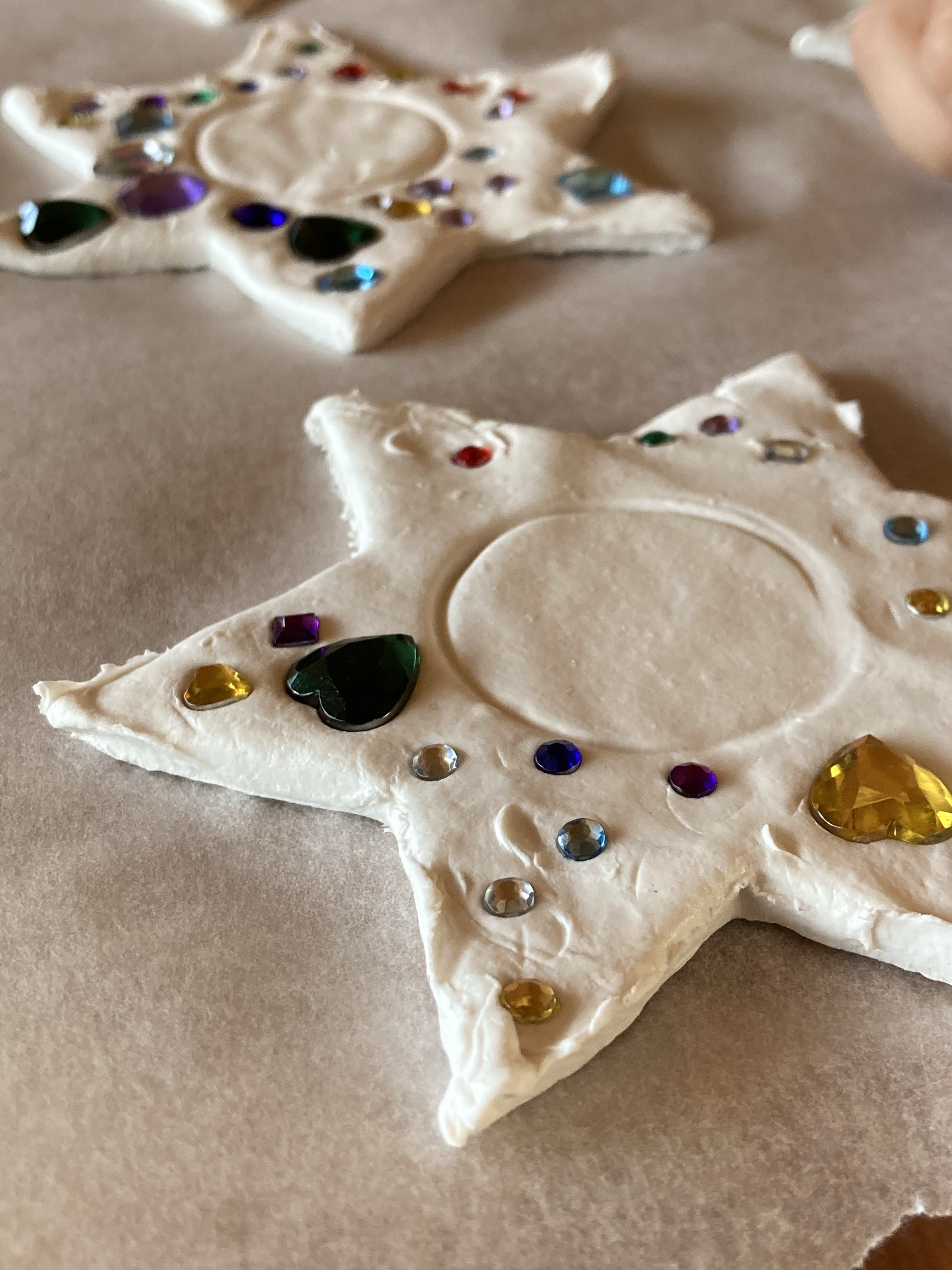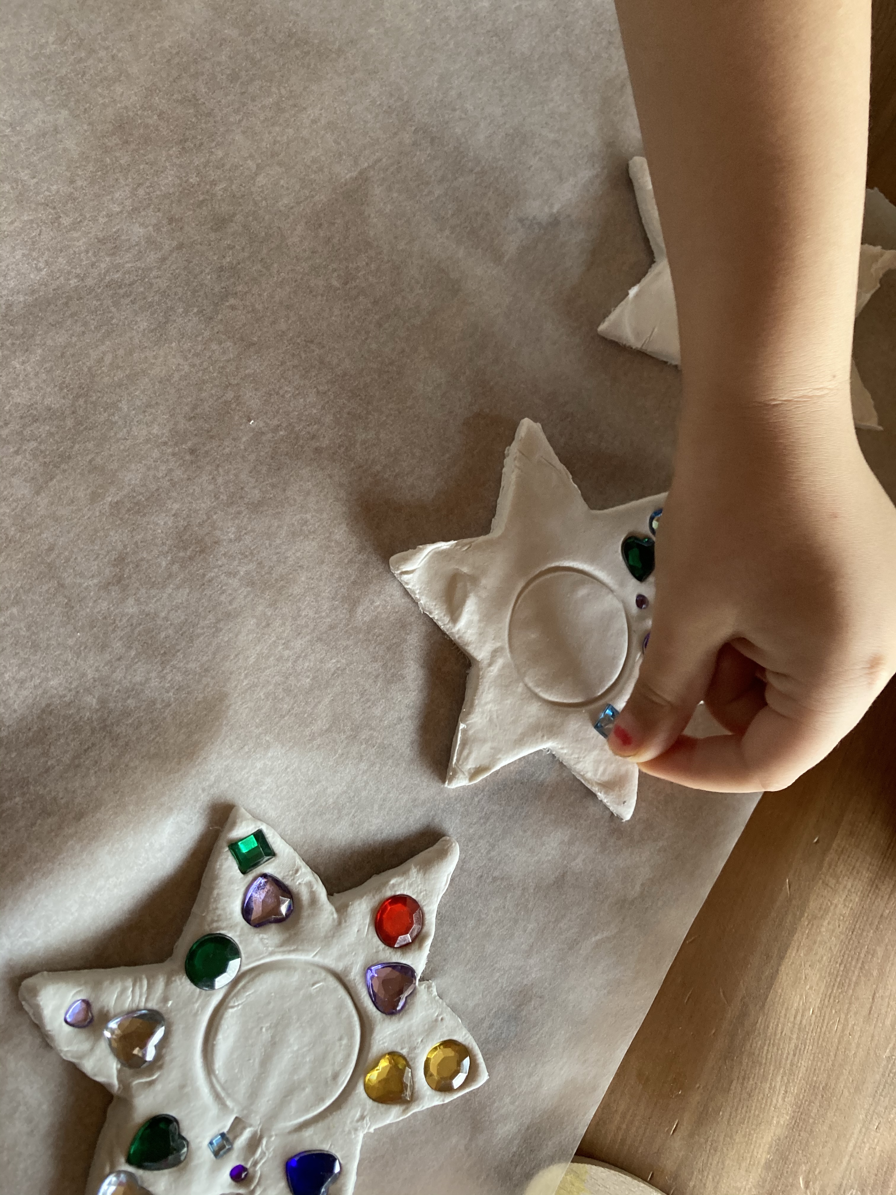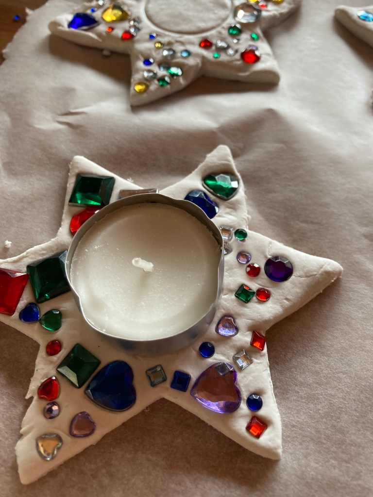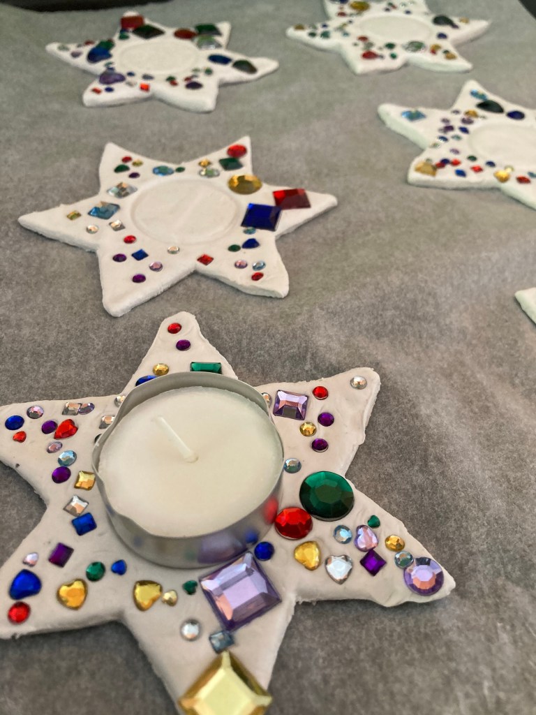 Die Modelliermasse auswallen und mit einem Sternenausstecher Formen ausstechen. In der Mitte mit einem Teelicht einen Abdruck machen. In dieser Aussparung keine Glitzersteine eindrücken, den übrigen Platz nach Belieben verzieren.