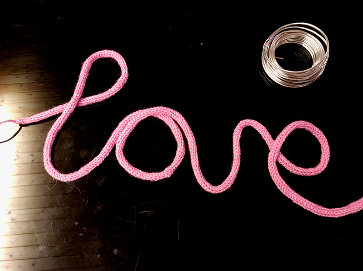 Als erstes macht man sich mit der Strickliesel an die Arbeit und «strickt» einen so lange Schnur, dass es für den gewünschten Schriftzug in der gewünschten Grösse reicht.