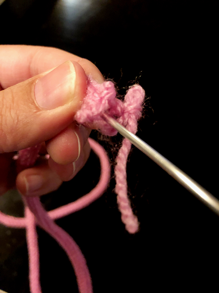 Den Aludraht in der Mitte der gestrickten Schnur durch die ganze Länge ziehen.
