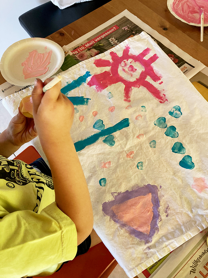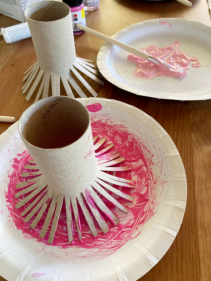 Bei einer leeren WC-Rolle haben wir kleine Streifen eingeschnitten und sie wie eine Blume in die Farbe getaucht und auf das Geschirrtuch gedrückt.