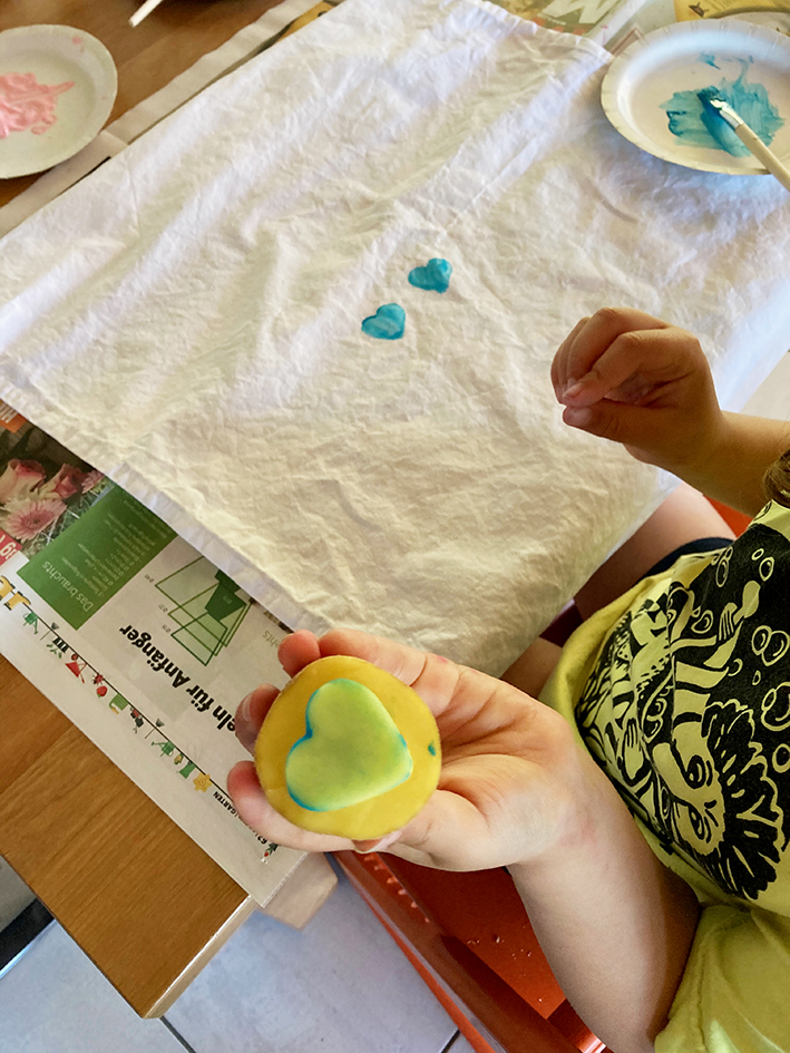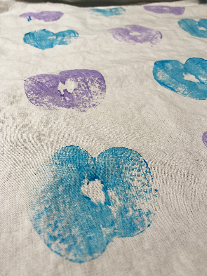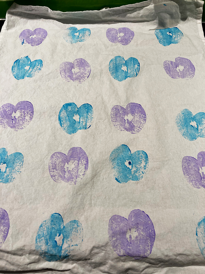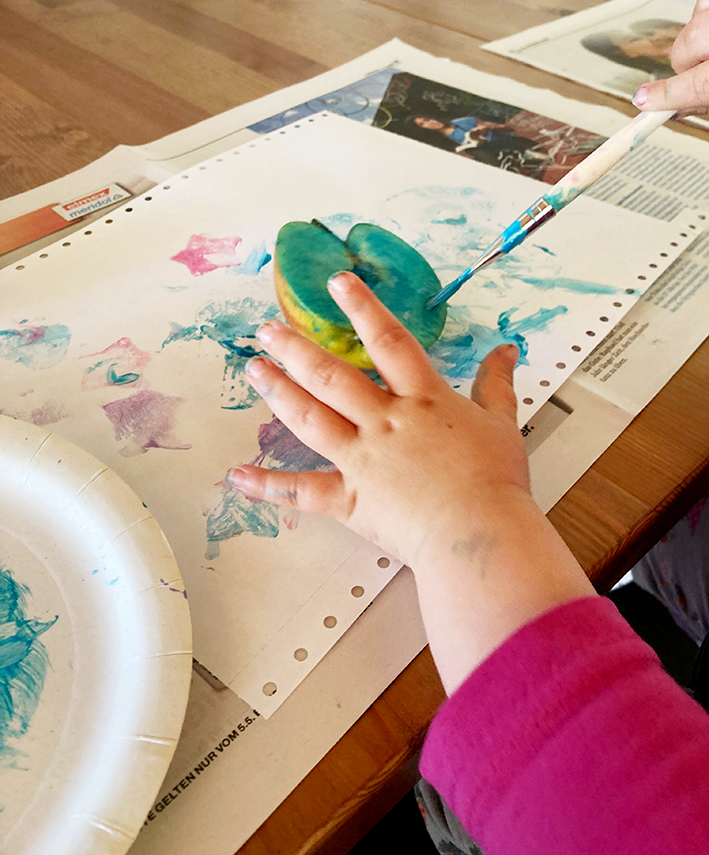 Zum einen haben wir Äpfel und Kartoffeln als Stempel gebraucht. Den Apfel haben wir einfach halbiert und die jeweiligen Seiten angemalt und auf das Geschirrtuch gestempelt. Abwechselnd in der Farbe ergab sich ein tolles Muster!