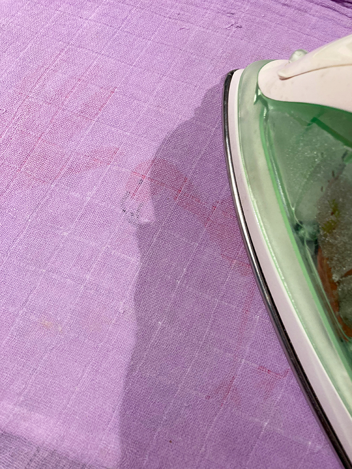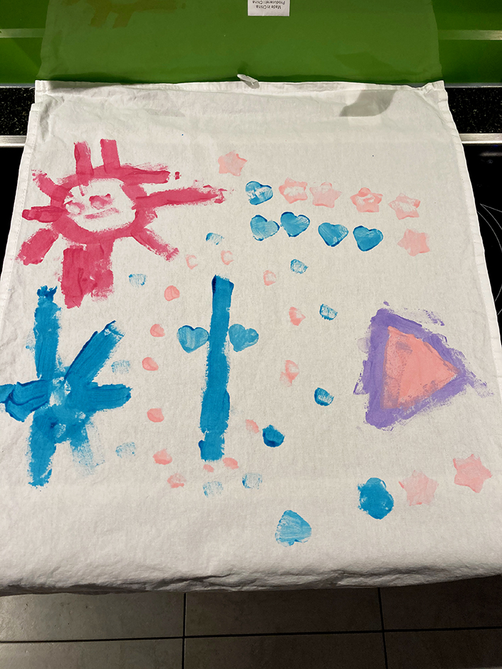 Als die Farbe trocken war, haben wir, damit die Farbe beim Waschen hält, sie eingebügelt. Zum Schutz des Bügeleisens ein Mulltuch über das Geschirrtuch und ohne Dampf glätten. Am Besten lest ihr dazu die Anleitung auf der von euch verwendeten Farbe!