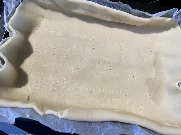 Den bereits ausgewallten Mürbteig in die Kuchenform legen und mit der Gabel ein paar mal einstechen.