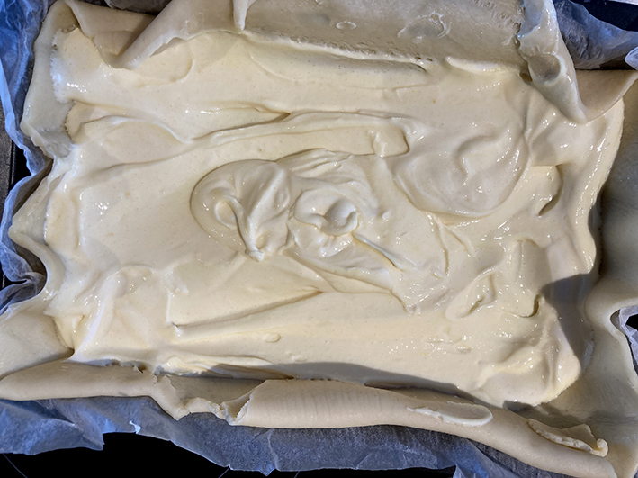 Den Magerquark und das Vanillepuddingpulver gut miteinander vermischen und auf den Teig geben.
